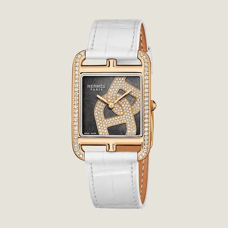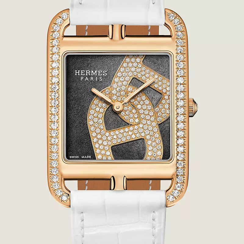 Diamond-set rose gold watch with drop-shaped inlays, quartz movement, diamond-set obsidian dial with "anchor chain" motif set with diamonds, and long interchangeable straps in cream matte alligator leather.