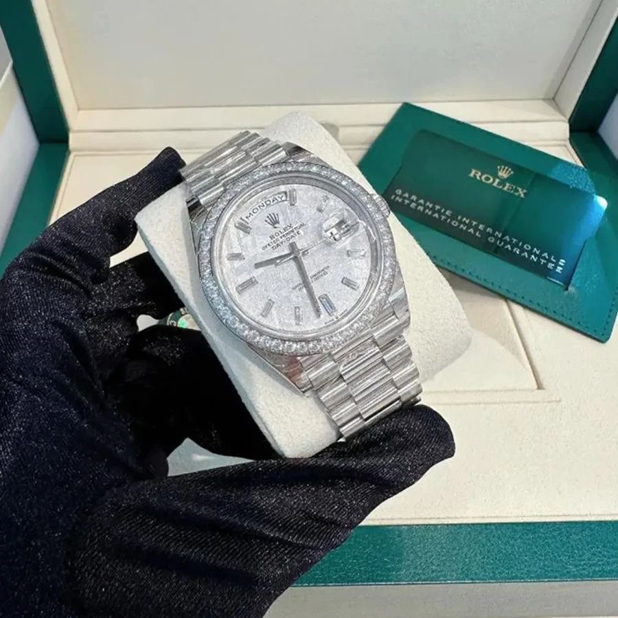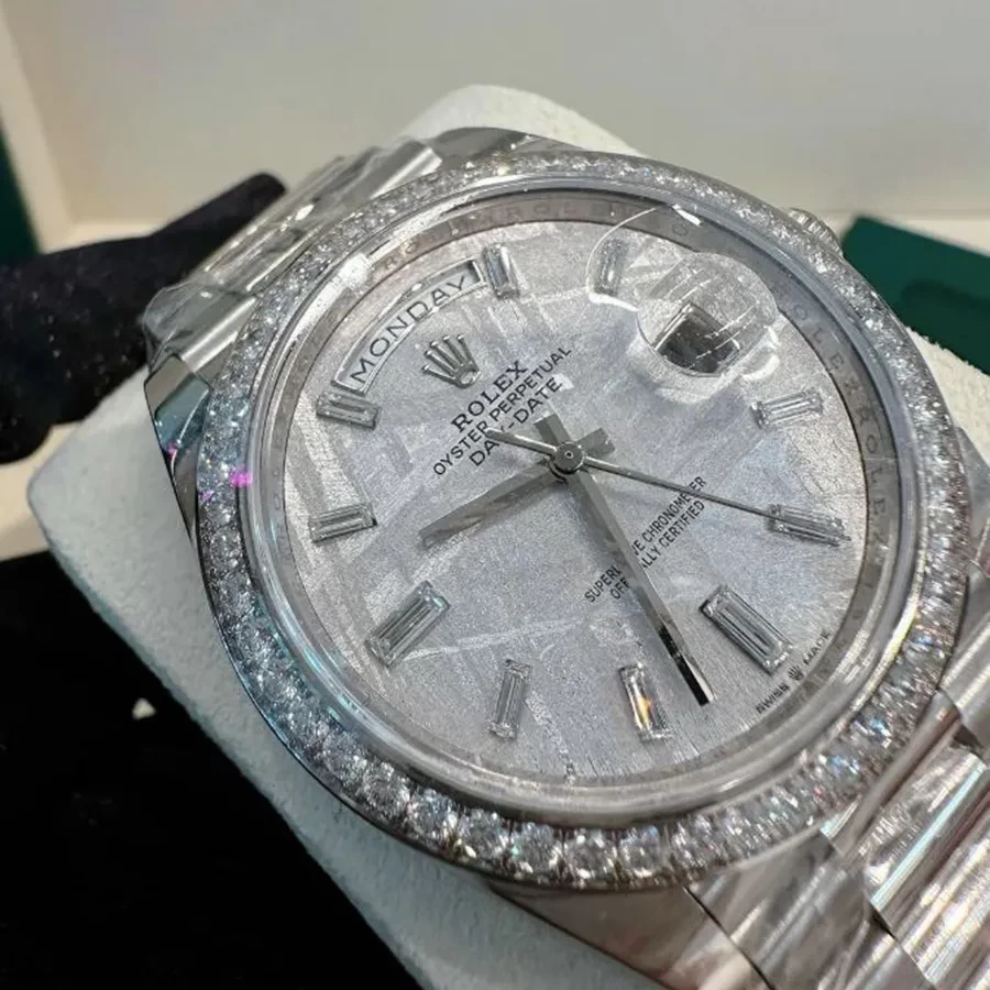 Hoàn thiện bằng bộ vỏ Oyster vàng trắng 18K tạo cảm giác “đầm” tay, đem đến những trải nghiệm sử dụng thật sự đẳng cấp và khác biệt. Sự kết hợp giữa mặt số tròn và dây đeo President 3 khớp nối mảnh, thiết kế bộ khóa gấp chắc chắn giúp ôm gọn vào cổ tay người dùng, tạo nên dấu ấn riêng của thương hiệu lâu đời.