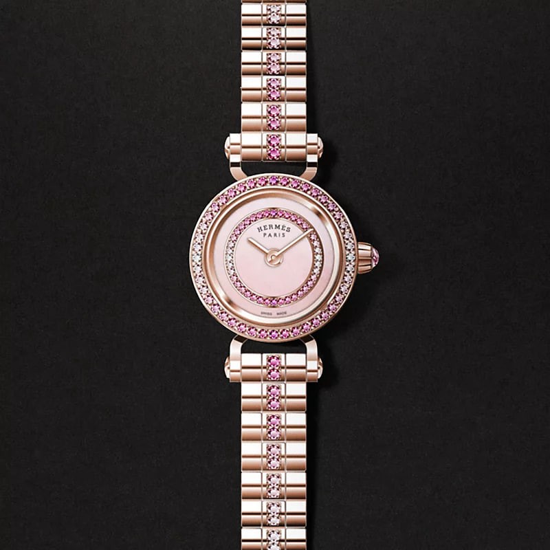 Rose gold watch with precious stones, quartz movement, rose opal dial with precious stones, rose gold bracelet set with precious stones.